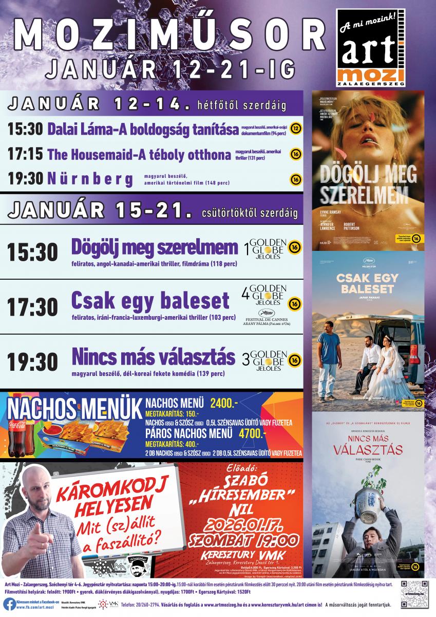 Jegypénztár nyitvatartása: naponta 15:00-20:00-ig. 15:00-nál korábbi film esetén pénztárunk filmkezdés előtt 30 perccel nyit. 20:00 utáni film esetén pénztárunk filmkezdésig nyitva tart. Telefon: 20/260-2794. Vásárlás és foglalás a www.artmozizeg.hu és a www.kereszturyvmk.hu/art címen is!